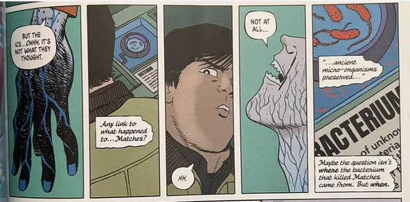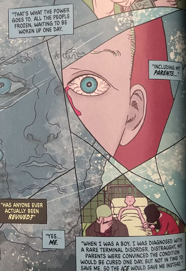 Ici, pas de femme, pas de costume mais toujours un lien étrange avec le froid. Dans cette version, le jeune Freeze était en phase terminale et c'est pour cette raison que ses parents ont utilisé la cryogénie sur lui. Malheureusement, la glace utilisée était un type de glace très spécifique qui a été déterrée et qui, surtout, remontait à la préhistoire. Une glace qui l'aura sauvé mais également maudit.