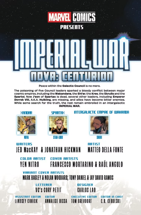 Les détails sont finalement tombés le mois suivant soit en mars 2025. Là, non seulement on découvre que les dessinateurs seront Federico Vincentini et Iban Coello mais aussi qu'Imperial sera une mini-série en quatre numéros dont le but final sera de redéfinir l'univers cosmique de Marvel.