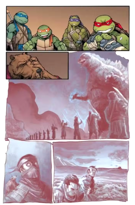 Après l'annonce et le synospsis, ce sont les premières planches du crossover TMNT x Godzilla qui sont enfin dévoilées. Au sommage : Godzilla, bien sûr et... le clan du Foot !