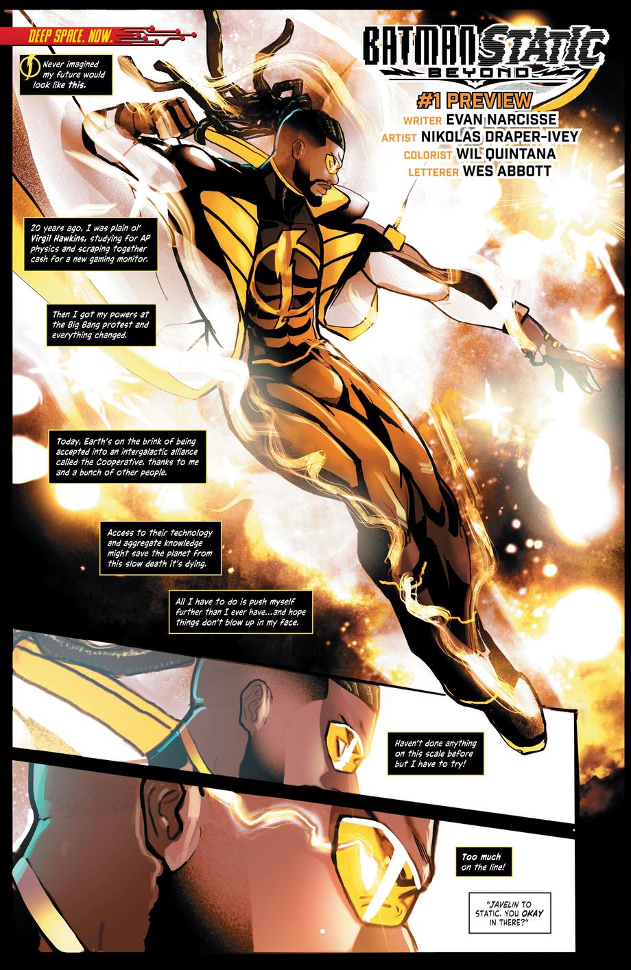 DC Comics l'avait annoncé l'été dernier. Une nouvelle série autour des super-héros du futur va être mis en avant. Super-héros... futur... vous pensez à l'univers de Batman Beyond ? Bingo ! Mais cette fois, il fera équipe avec Static de la série animée Static Shock. Intitulée Batman/Static: Beyond, la série tiendra en six numéros et sera écrite par Evan Narcisse avec des dessins de Nikolas Draper-Ivey.