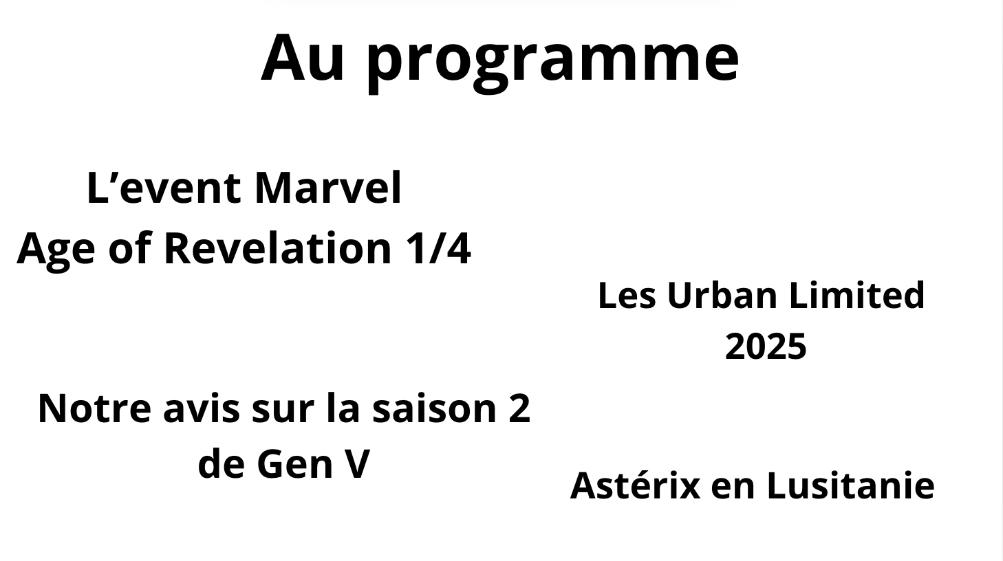 Le prochain live Twitch... c'est ce soir 20h ! Nous commencerons par l'event Marvel Age of Revelation. Nous vous le présenterons et enchaînerons avec notre avis sur les premiers numéros. Nous continuerons avec Les Urban Limited 2025. Qu'est-ce que c'est ? Quels sont les titres choisis cette année ? Valent-ils le coup ? Nous verrons tout cela ensemble. Ensuite, nous basculerons sur notre avis sur la saison 2 de Gen V qui vient tout juste de s'achever. Enfin, nous terminerons par donner notre avis sur le tout dernier Astérix : Astérix en Lusitanie. Oui, il sort aujourd'hui, mais on est au taqué !