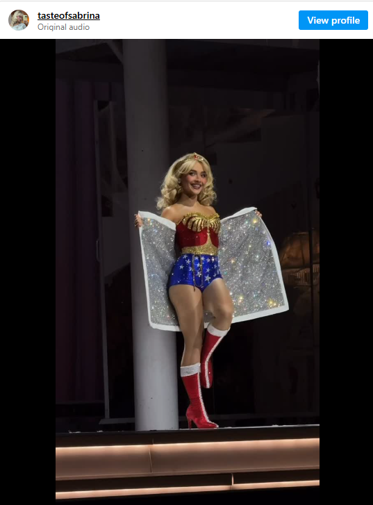 Ce 31 octobre, c'était bien évidemment Halloween. Pour l'occasion, Sabrina Carpenter s'est déguisée en Wonder Woman lors d'un show au Madison Square Garden, à New-York. Jusque-là, tout va bien. Un show, New-York, Wonder Woman, on est pas mal.