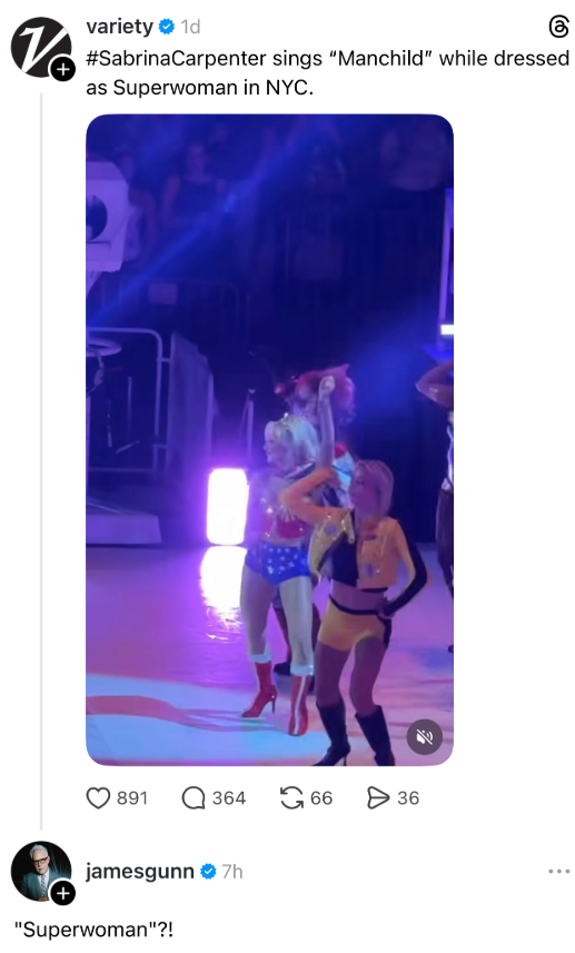 Sauf que voilà, Variety a fait une erreur, malheureusement assez classique, en partageant la news et en mettant en commentaire "Sabrina Carpenter chante "Manchild" déguisée en Superwoman à NYC".
