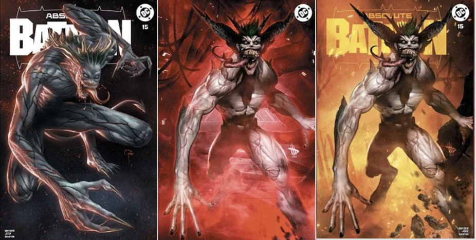 Le mois prochain, c'est Absolute Batman #15. Et autant dire que le titre est attendu de pied ferme puisqu'il mettra en avant Absolute Joker en version monstrueuse. Pour l'occasion, une floppée de covers ont été réalisées et, sans surprise, c'est la revisite du Joker qui a été mis en avant.